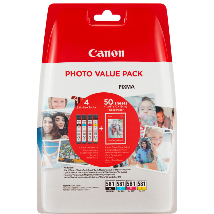 Met het Canon CLI-581 Photo Value Pack inclusief Canon GP-501 Fotopapier haalt u alles in huis voor het afdrukken van levensechte en schitterende foto's. Dit waardevolle pakket biedt de perfecte combinatie van een inktpatroon en fotopapier om uw herinneringen vast te leggen en te delen zoals nooit tevoren.