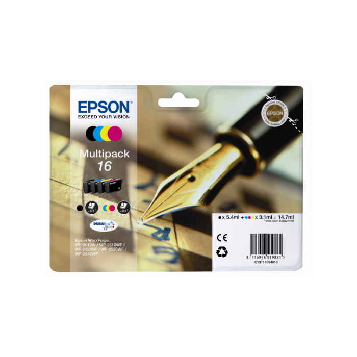 Kies voor het Epson 16 L Multipack (4 kleuren) C13T16264010 en til uw afdrukken naar een hoger niveau. Geniet van consistente en professionele resultaten, of het nu gaat om zakelijke documenten, schoolprojecten of foto's. Met deze originele cartridges bent u verzekerd van kwaliteit, betrouwbaarheid en gebruiksgemak, en kunt u met een gerust hart blijven afdrukken. Investeer in de beste afdrukkwaliteit en maak van elk printproject een succes met de Epson 16 L Multipack.