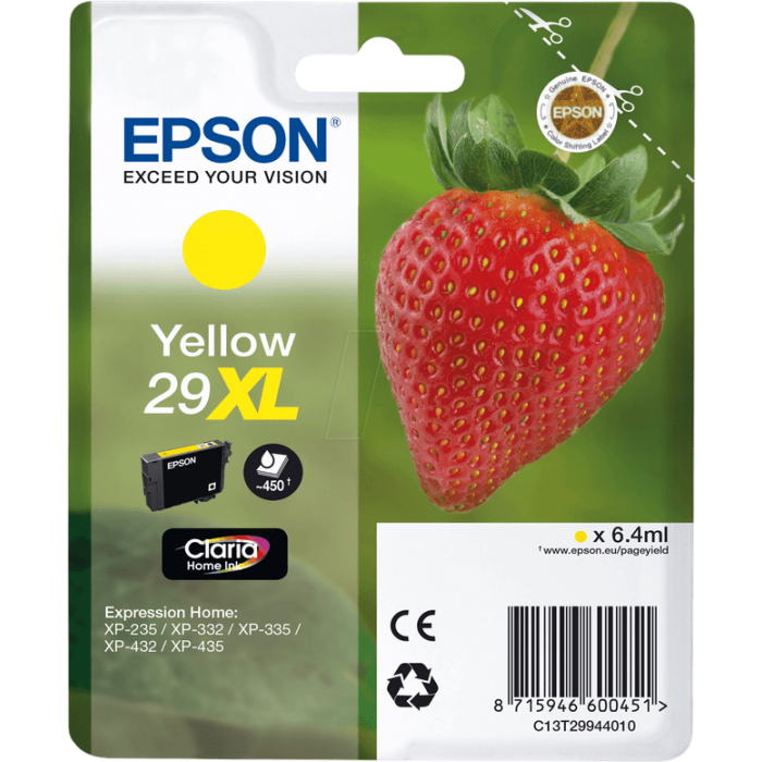 Met de Epson 29 Cartridge Cyaan XL kunt u vertrouwen op heldere en levendige kleuren. Of u nu belangrijke documenten afdrukt voor uw werk of prachtige foto's wilt maken van waardevolle momenten, deze cartridge zorgt ervoor dat uw prints tot in het kleinste detail worden weergegeven.