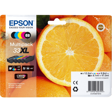 De Epson 33 5-Kleuren Pack XL (C13T33574010) bevat vijf verschillende kleuren cartridges: zwart, cyaan, magenta, geel en fotozwart. Hiermee ben je verzekerd van nauwkeurige kleurweergave en heldere prints. Of je nu belangrijke documenten afdrukt of foto's wilt printen, met deze cartridges bereik je professionele resultaten.