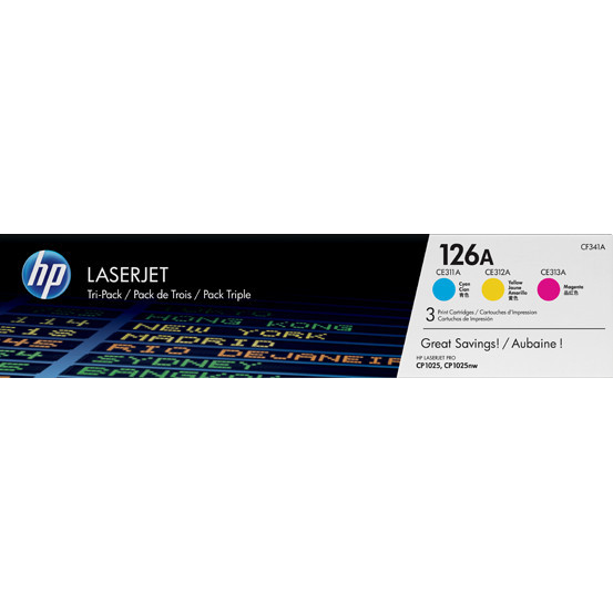 Met de HP 126A LaserJet Toner Tri-pack (CF341A) haal je het beste uit jouw HP LaserJet printer. Dit tonerpakket bevat drie hoogwaardige cartridges in de kleuren cyaan, magenta en geel. Dankzij de professionele kwaliteit van HP ben je altijd verzekerd van haarscherpe teksten en levendige kleuren in al je afdrukken.